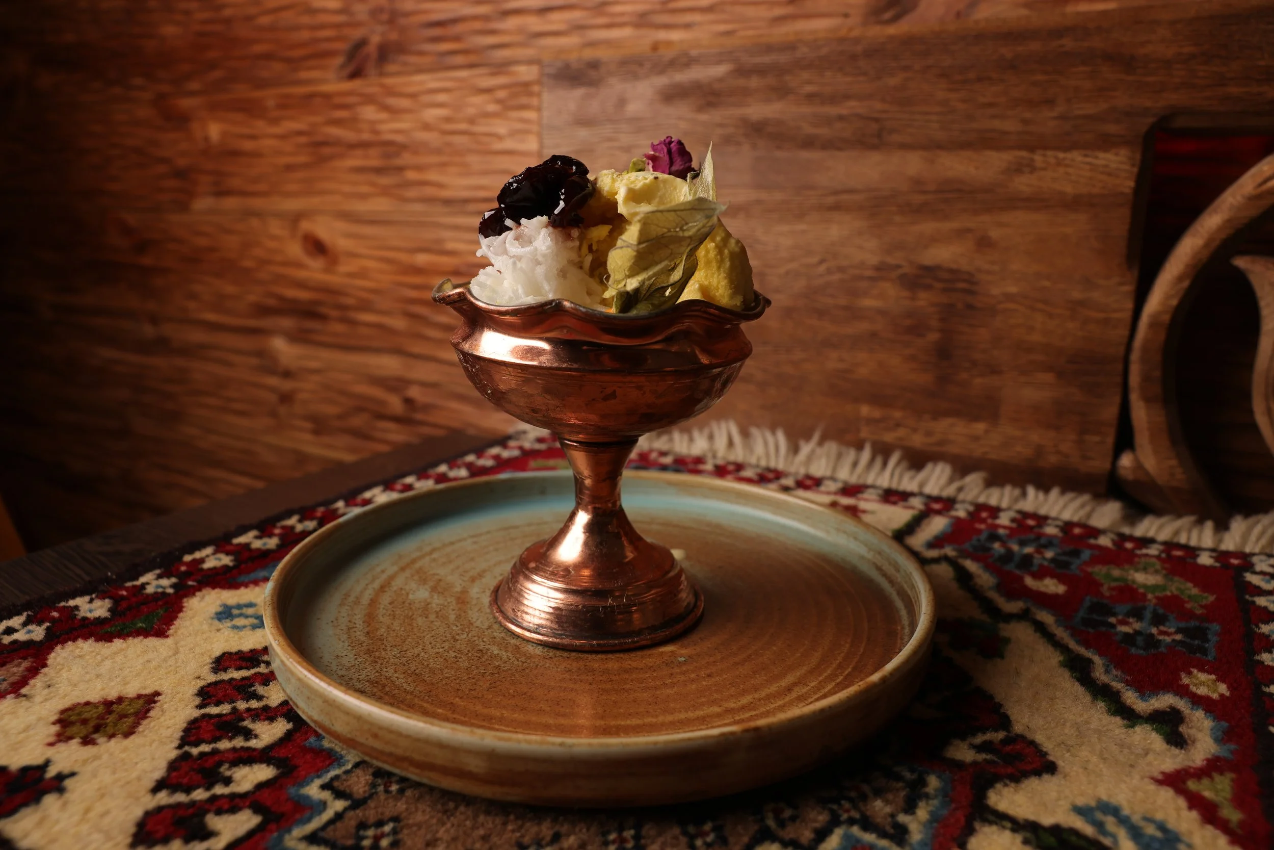 Yoghurt dricka toppad med torkade rosenblad och minta..